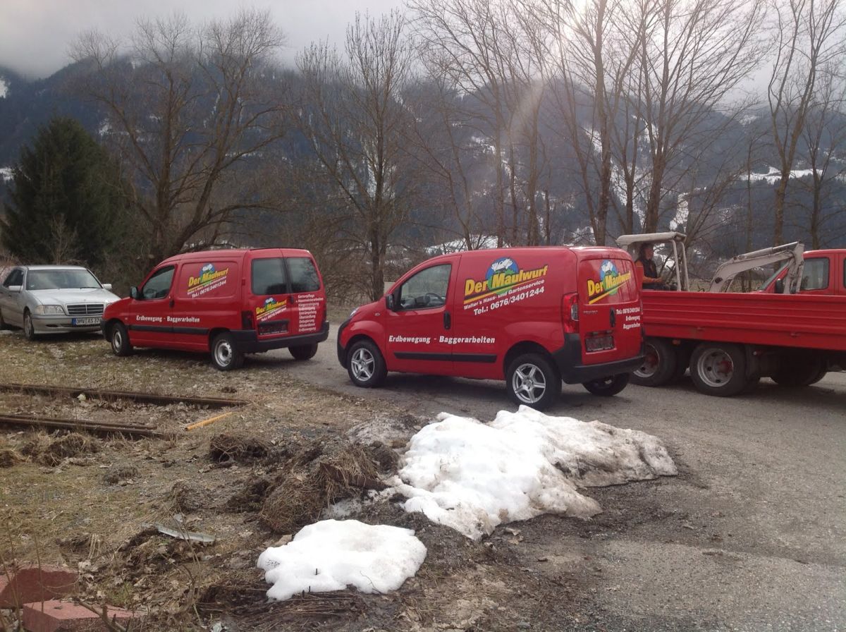 Vom Bagger, über Transporter bis hin zu ladestarken Lastkraftwagen: Der Maulwurf verfügt über einen breiten und modernen Fuhrpark um den Anforderungen jeder noch so schwierig erscheinenden Situation, gerecht zu werden.